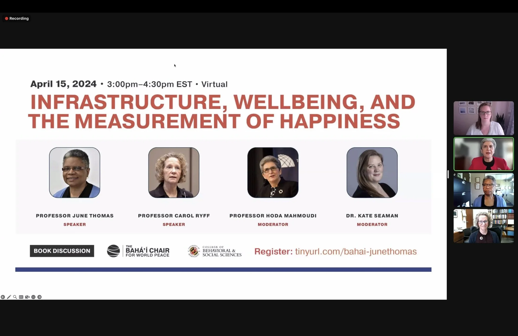 On April 15th, the Baha’i Chair for World Peace hosted a virtual event featuring two contributors to the recent volume, “Infrastructure, Wellbeing, and the Measurement of Happiness.” This edited volume takes an interdisciplinary approach to examining infrastructure’s influence on happiness and wellbeing. Professor June Thomas and Professor Carol Ryff partook in meaningful dialogue on the current thinking surrounding how infrastructure design and construction can positively impact people’s wellbeing.