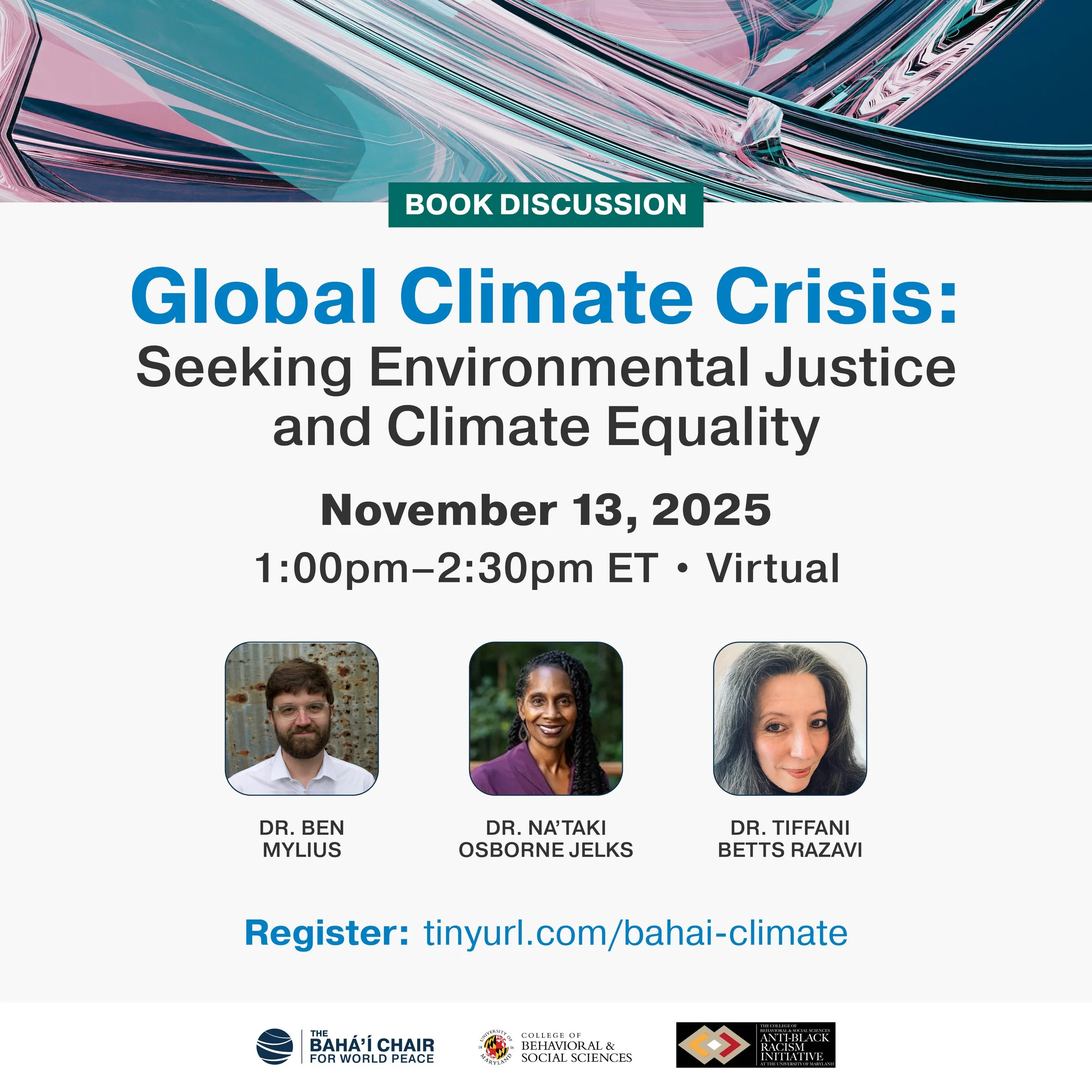 This event features three of the contributors to the recent volume published by the Bahá’í Chair for World Peace, Global Climate Crisis: Seeking Environmental Justice and Climate Equality, Dr Ben Mylius, Dr Na’Taki Osborne Jelks and Dr Tiffani Betts Razavi. The discussion will explore the questions raised in the volume around approaching the challenge of climate justice from the perspective of environmental justice. The discussion will be moderated by Professor Hoda Mahmoudi and Dr. Kate Seaman, the editors of the volume.