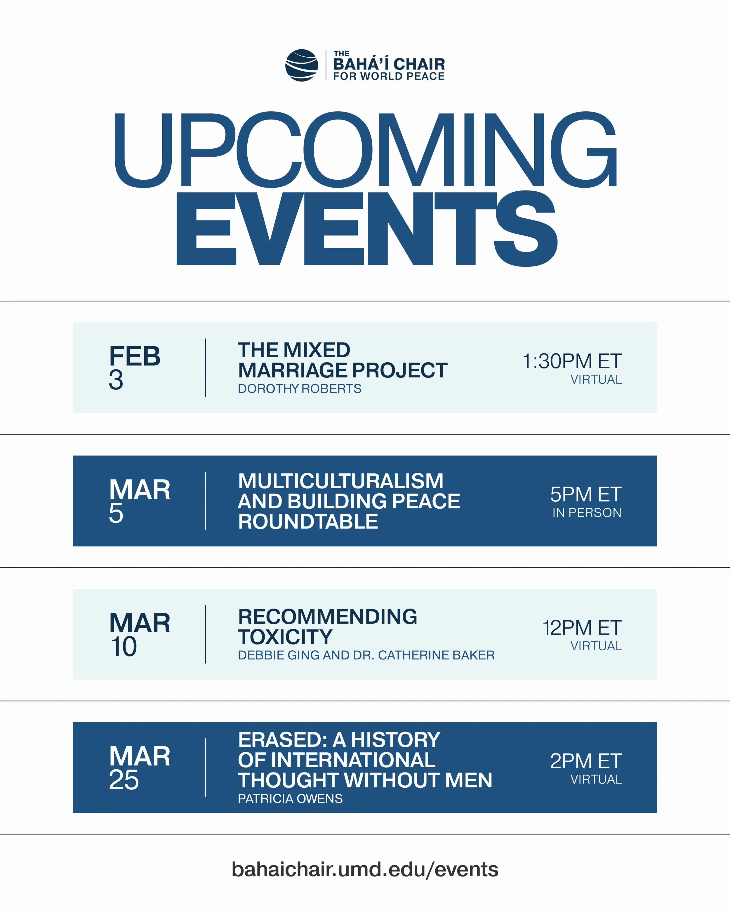 The Baha’i Chair for World Peace at the University of Maryland is proud to share with you our exciting semester schedule of talks, lectures, and special events. As always, these events share a common pursuit – addressing the challenges to peace with careful consideration and a bias toward transformative action.